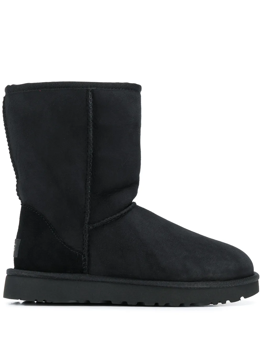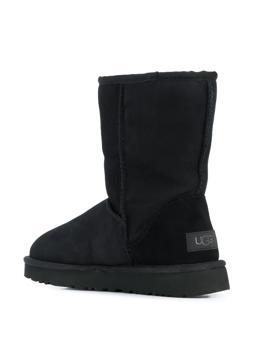 Black leather slip-on boots from UGG featuring a round toe, a slip-on style and a ridged rubber sole.