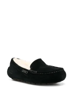 touch-strap suede slippers from UGG featuring black, calf suede, front touch-strap fastening, adjustable strap to the front, logo patch to the side, round toe, slip-on style and flatform sole.
